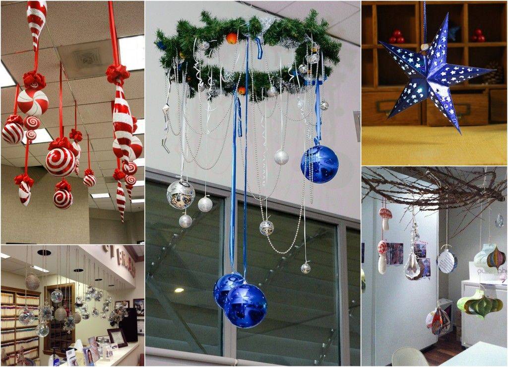 Люстра и свободное место на потолочном пространство будут симпатично смотреться с подвесными украшениями из лент и игрушек. В качестве заготовок подойдут бумажные самодельные игрушки, шары, бусы, декоративные ленты, ветви деревьев, плотные цветные нити.