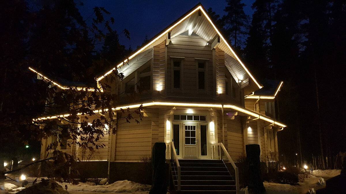 Фасад своего дома можно украсить с помощью светового оформления. Среди самых популярных можно отметить: