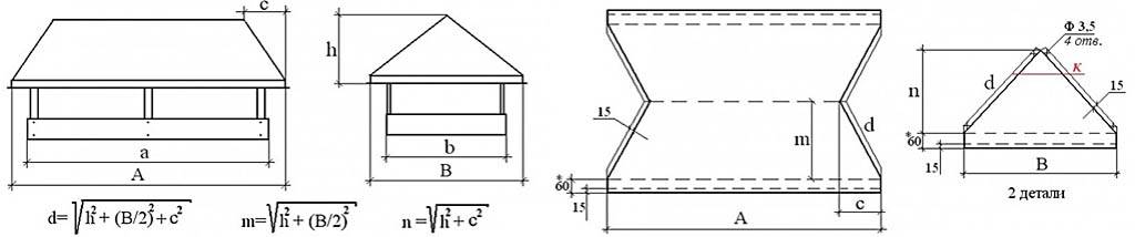 Далее нужно научиться по наружным размерам размечать выкройки деталей дефлектора. Для тех, кто предпочитает учиться наглядно, даем подборку видеоуроков по изготовлению деталей дымовых дефлекторов: