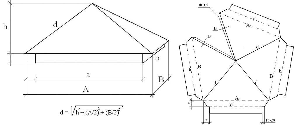 Аналогичным способом строится развертка и собирается вальмовый шатер (зонт) дымника, см. рис.