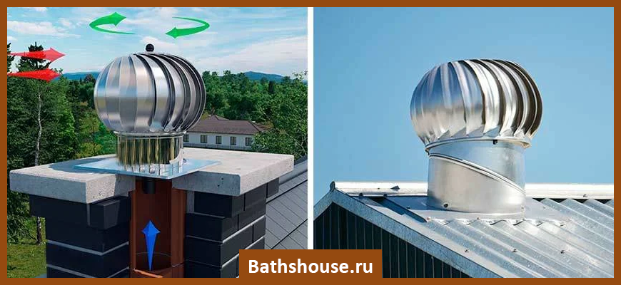 - Использование дефлекторов, флюгеров, ротационных турбин в качестве оголовка дымохода;