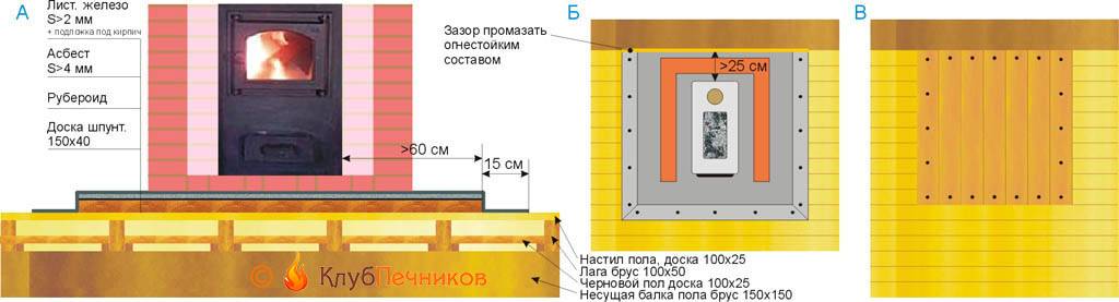 Схема установки металлической печи в кирпичном экране на пол без фундамента