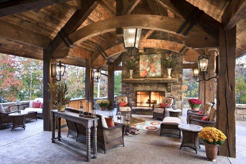 - Закрытые – дом небольшого размера. В основном его остекляют, устанавливают вентиляцию, устанавливают двери и окна. Камин применяют для отопления. Использовать можно круглый год. Интерьер, мебель могут быть любыми.