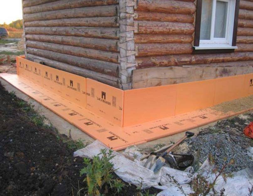 Для этого фундамент откапывают по всему периметру, очищают от земли. После этого в основании устраняют все трещины и устанавливают гидроизоляцию. Защита от влаги может быть выполнена обмазочным способом, например, битумной мастикой или с помощью оклейки гидроизоляционными материалами (как вариант, рубероидом). В траншею насыпают утеплитель и заливают бетонную стяжку.