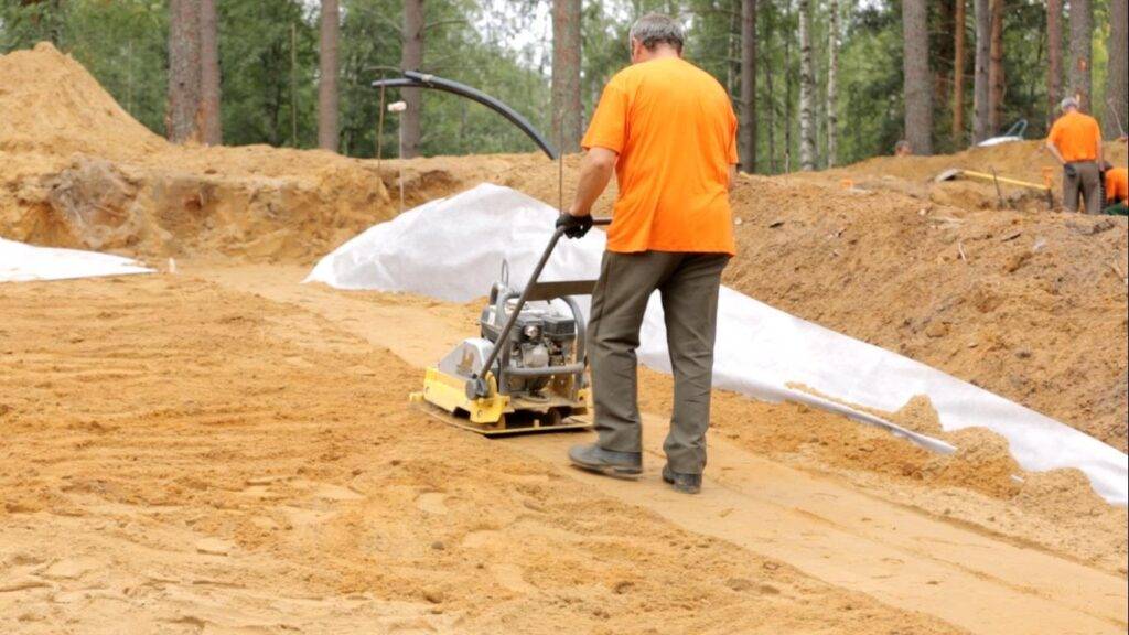 Дно готового котлована застилают геотекстилем, на него насыпают слой щебня, сверху слой песка (идеальный вариант – разделить разнофракционные материалы еще одним отрезом геотекстиля). Каждый слой тщательно проливают водой и трамбуют виброплитой.