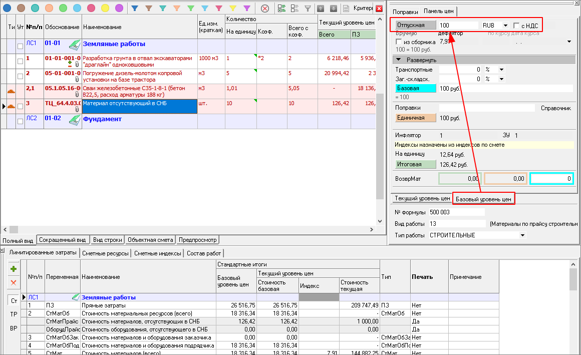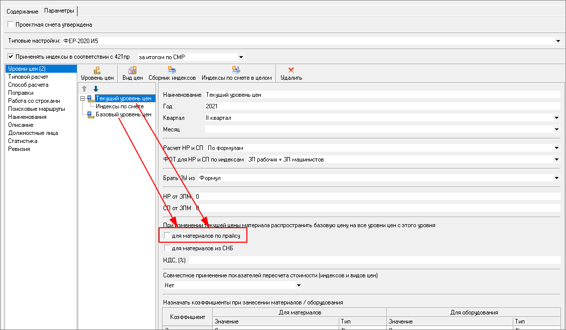 В соответствии с Приложением №2 к Методике определения сметной стоимости строительства, сметная стоимость на материалы и оборудование, отсутствующих в СНБ, определяется в базисном уровне цен как отношение их стоимости в текущем уровне цен к соответствующим индексам изменения сметной стоимости. При составлении сметы в двух уровнях цен (базовом и текущем) необходимо отключить параметр во всех уровнях цен При изменении текущей цены материала распространять базовую цену на все уровни с этого уровня цен — для материалов по прайсу: