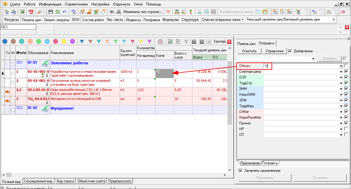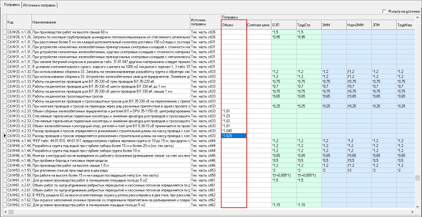 Во все способы назначения поправок в смете и акте добавлена возможность назначения поправки на объем: