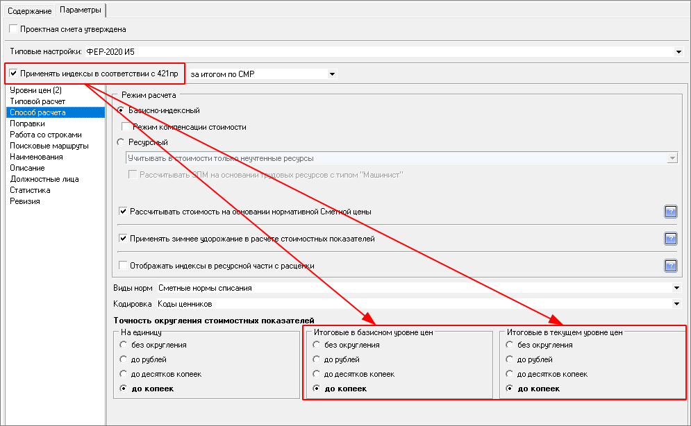 В параметрах объекта, при использовании параметра Применять индексы в соответствии с 421пр, на вкладке Способ расчета появляется возможность отдельно задавать точность округления для итоговых стоимостных показателей базисного и текущего уровня цен: