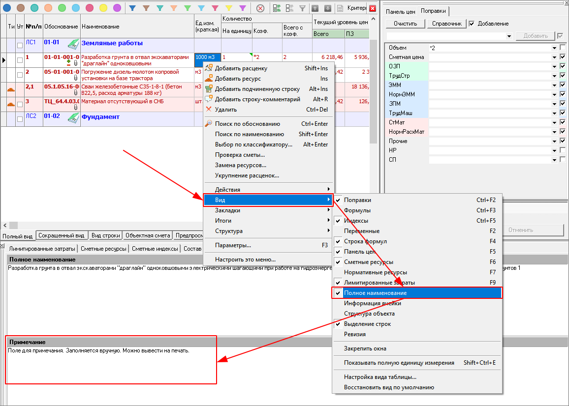 В проектной смете и актах добавлена возможность задать Примечание к сметной строке в окне Полное наименование: