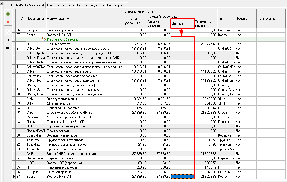 В лимитированных затратах колонка индекс заполняется в соответствии с условиями назначения индексов — они могут быть разными для Локальных смет, входящих в состав одного объекта: