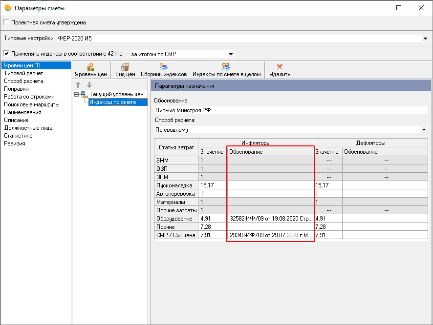 При необходимости составить смету в одном уровне цен (базовом или текущем) достаточно добавить или инфляторы и обоснование или дефляторы.