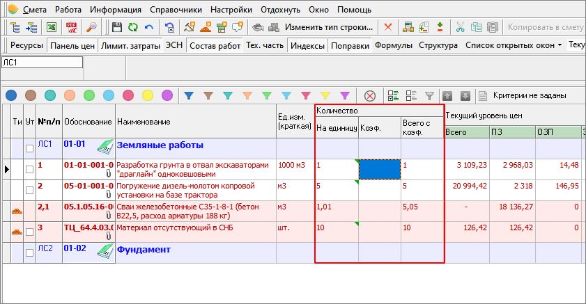 В проектной смете и актах выполненных работ добавлены новые колонки Количество На единицу, Коэф., Всего с коэф.: