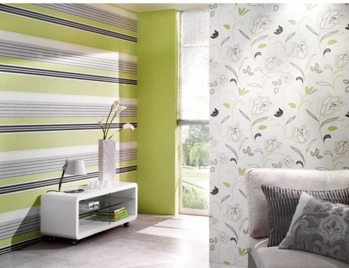Хорошо сочетаются однотонные и с рисунком в виде широких или узких полос. Такой декор визуально увеличивает высоту потолка и создает эффект более просторного помещения.