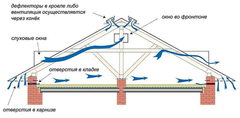 Образуется нижним фрагментом скатной крыши. Сквозь него воздушные массы проходят на чердак. В случае обустройства отапливаемой мансарды, снизу ската воздух поступает в подкровельное пространство, проходит наверх и выводиться через конек или аэратор, так выполняется вентиляция всех элементов «кровельного пирога».