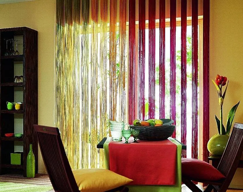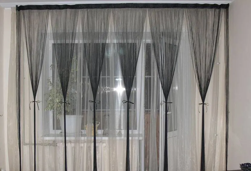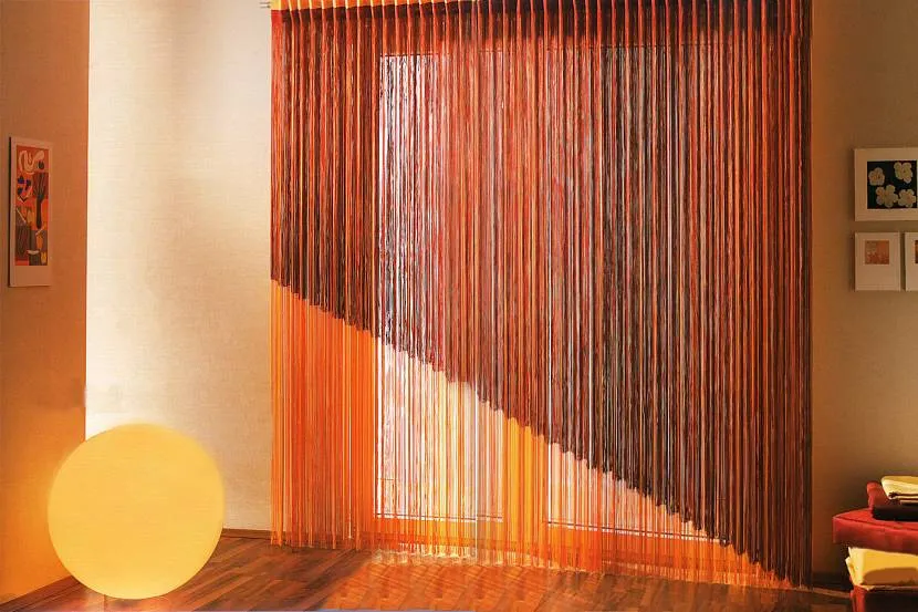 Кроме декоративной функции, нитяные шторы имеют много других, к примеру, деление пространства на зоны, защита комнаты от солнечных лучей и прочее. Ширина штор выбирается на свое усмотрение, а вот длина в основном имеет два типа. Короткий блок веревок может достигать подоконника или быть немного длиннее, а долгий в любом случае достигать пола