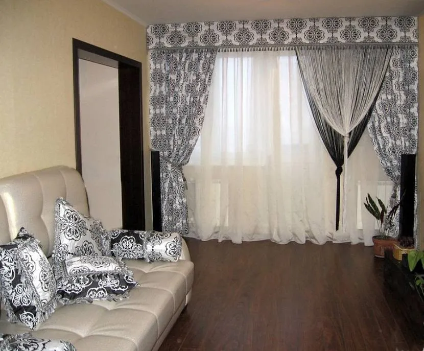 Сочетание нитевых штор двух оттенков чаще всего используется в моделях с ламбрекеном. Они могут быть контрастными и близкими по палитре. Чисто белый и часто черный цвет, не самый распространённый вариант использования в декоре окна. Зачастую применяют их комбинацию вместе либо с другими оттенками.