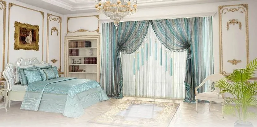 Великолепие и блеск интерьера в стиле барокко подчеркнет кисея глубокого, благородного цвета. Не лишними здесь окажутся вкрапленные бусины, а завершит образ драпировка, кисти и подхваты, мягкие портьеры. Нитяные занавески уютно вплетаются в восточный стиль.