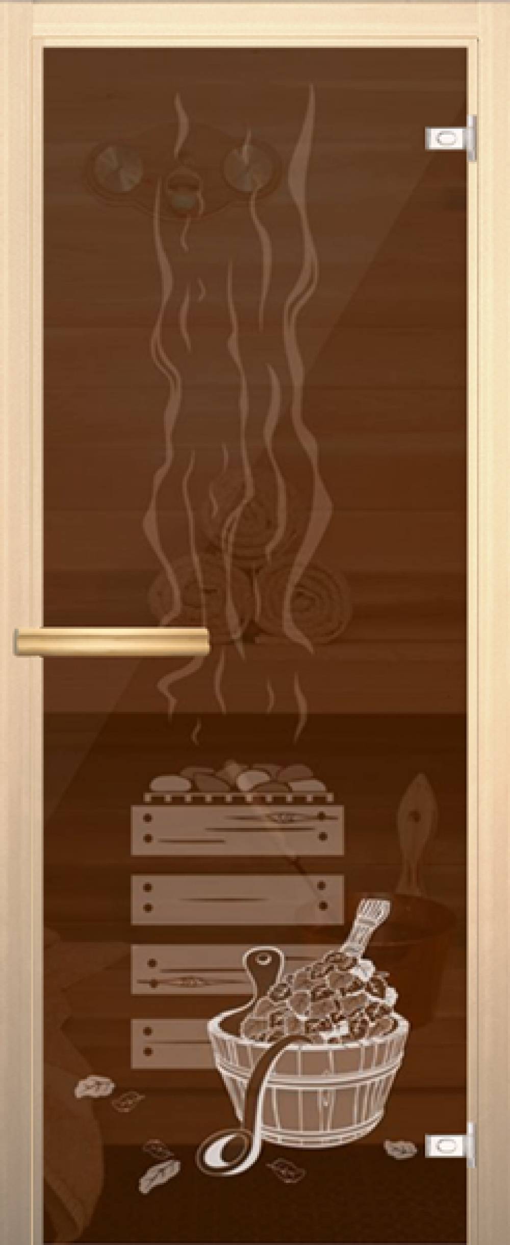 Двери имеют небольшие рисунки на поверхности стекла, нанесённые на него запекаемой керамической краской. Визуально они расширяют пространство бани.