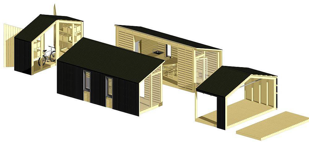 - Модульный дом. На стройплощадку доставляют единый блок или несколько модулей-комнат с теплоизоляцией, фасадной отделкой и окнами. Остается установить дом на фундамент, закрепить крышу и сделать косметический ремонт внутри. Недостаток метода – трудоемкость перевозки и монтажа.