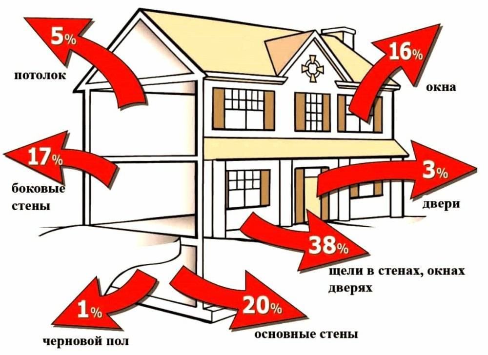 Чаще всего (даже при правильном подборе материала постройки) утечки тепла происходят в следующих элементах конструкций: