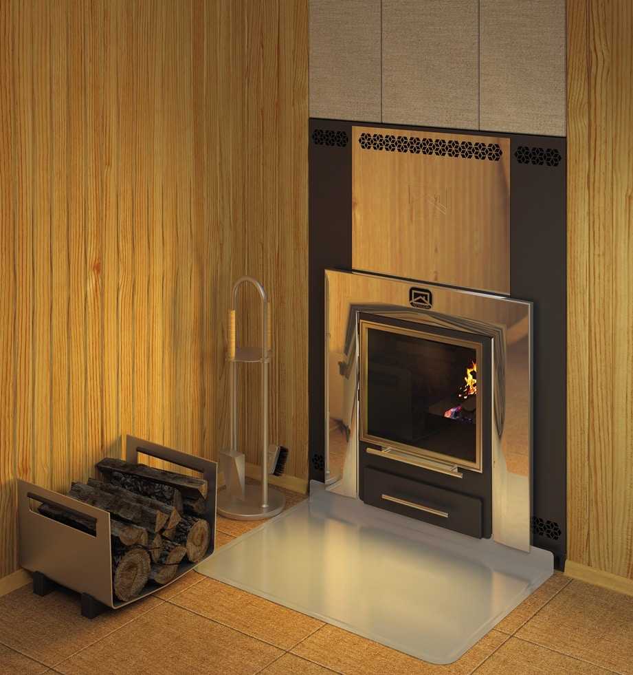 Огнеупорная обшивка стен вокруг печи делится на светоотражающую и с облицовкой. Первый вид обычно состоит из металлических листов с жаропрочными теплоизоляционными материалами. Теплоизоляция крепится к деревянной стене, затем покрывается снаружи листом из нержавеющей стали, отполированной до зеркального блеска. Между обшивкой и деревянной стеной необходимо предусмотреть наличие вентилируемых зазоров размером 2-3 см. При этом огнеупорные листы крепятся через керамические втулки. В качестве теплоизоляции используются: