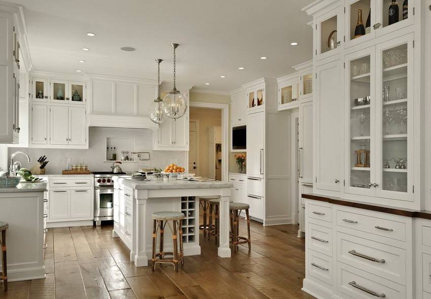 Побеленный потолок могут украшать деревянные балки. По периметру допускается изящная неброская лепнина. Акцентным элементом помещения будет камин, который может располагаться в углу или возле одной из стен. Он повторяет оттенок стен или окрашивается в белый цвет.