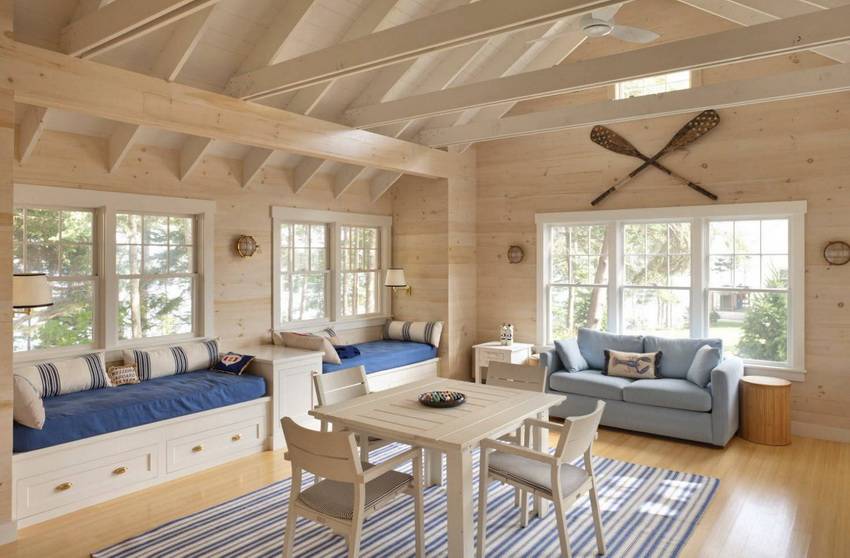 Если диван — то с каркасом из дерева и светлой обивкой. Модели с деревянной спинкой и подлокотниками гармонично впишутся в интерьер загородного дома. В качестве альтернативного варианта можно включить в интерьер кушетку.