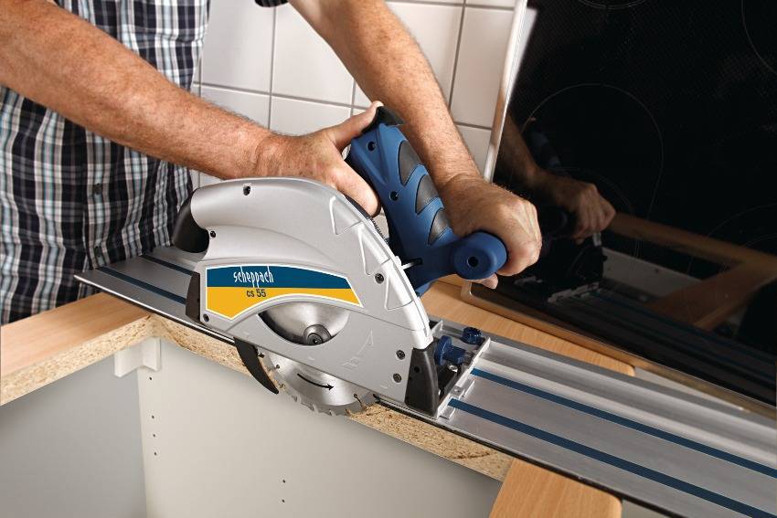 Погружная циркулярная пила имеет подвижный пильный диск. Режущая кромка инструмента опускается в центр заготовки, начиная распил с этого места, выполняя сквозные отверстия.