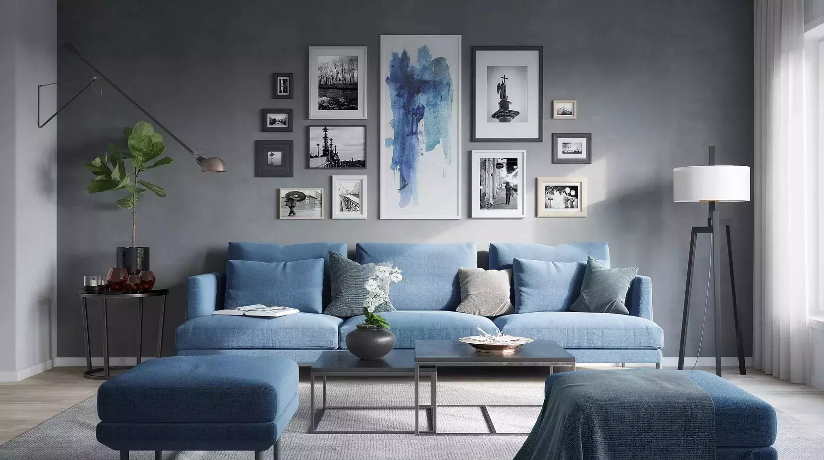 Если окна выходят на южную сторону, то гостиная может быть и холодных оттенков, так как в комнате достаточно дневного освещения. Небесно-синий, бирюзовый и белый.