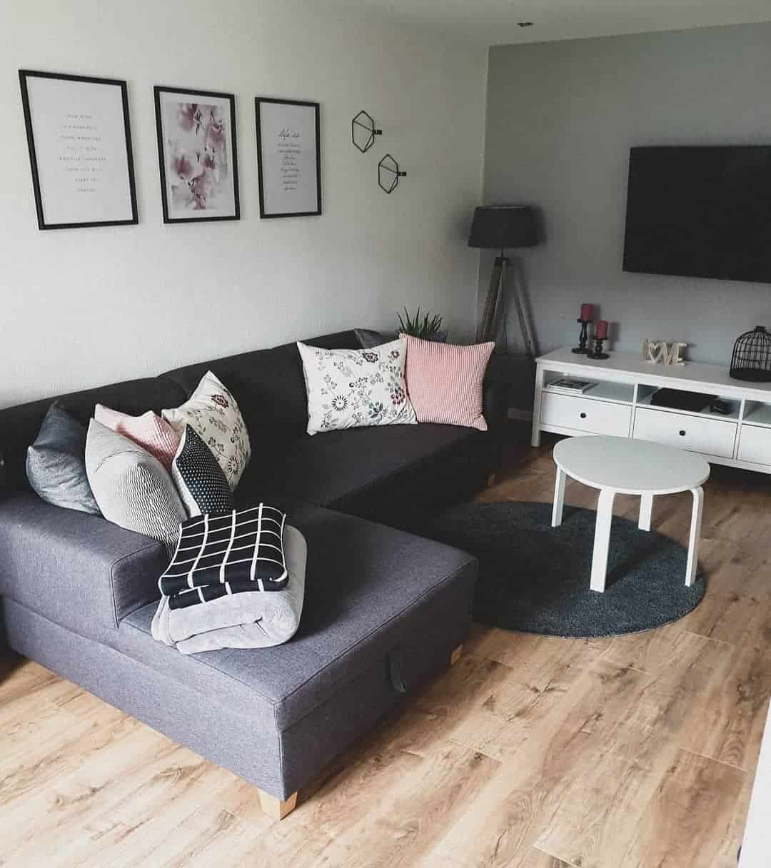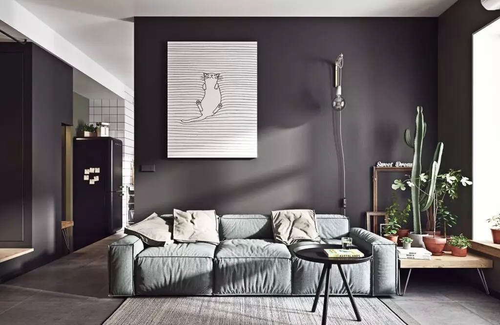 - бетонный пол (серый) + белая штукатурка (стены) + уютные мягкая мебель и текстиль ярких цветов;
