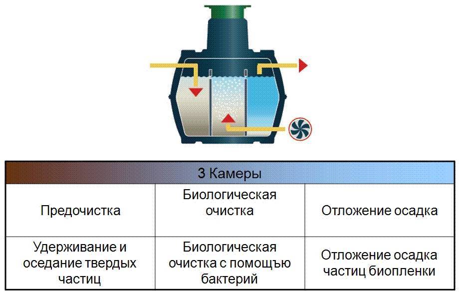 Переработка органики достигается анаэробными, аэробными бактериями. Жизнедеятельность, переработка стоков анаэробными частицами реализуется в бескислородной среде герметичных емкостей. Аэробные бактерии требуют беспрепятственного поступления кислорода. Микроорганизмы самостоятельно воспроизводятся, исключая необходимость регулярного добавления бактерий к стокам. От обычных выгребных ям септик выгодно отличается отсутствием запаха, необходимостью откачки отходов ассенизатором.