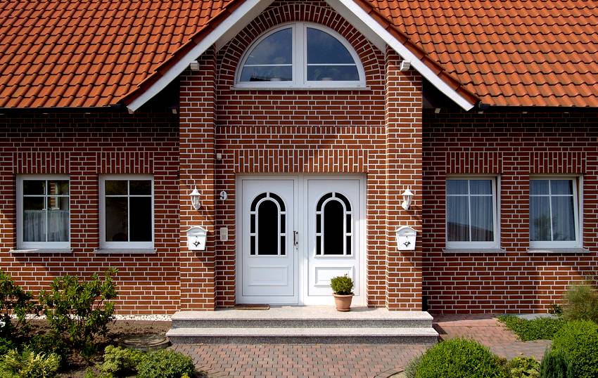 - Фасад можно облицевать как в едином цвете, так и в двух оттенках. Но при этом стоит помнить, что более светлый цвет кирпича лучше укладывать на стены, а более темный контрастный – на цоколь и углы дома.