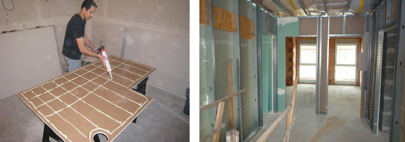 Крепление листов к стене производят двумя способами: по направляющим (при перепадах до 40 мм) и на клеящий состав (при перепадах до 4 мм).