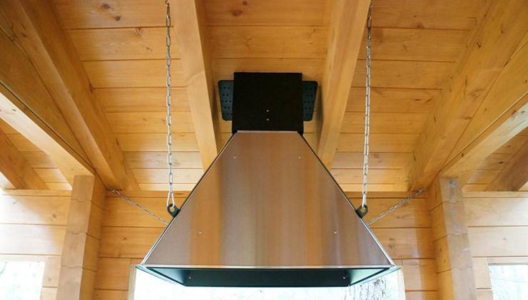 Вытяжка для мангала может быть декорирована и деревом — металлический вытяжной зонт обшивается деревом с использованием термоизоляционных прокладок.