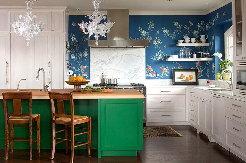 Кухонные апартаменты в таком исполнении будут выглядеть царским величием. Несмотря на яркость каждого отдельного оттенка, палитра создана взаимодействовать между собой, как небо и трава.