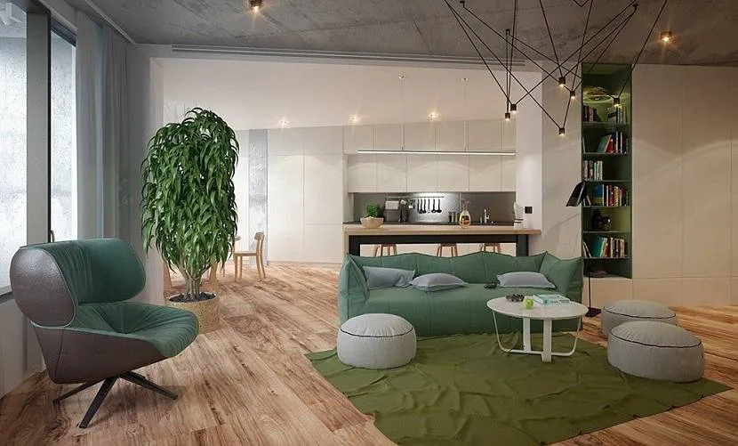 Для любителей более строгого интерьера в зелено-белую гамму рекомендуется добавить различные оттенки серого. Серым можно отделать, например, пол. Серо-зеленый интерьер без белого выглядит очень красиво, но немного однообразно. Поэтому можно к нему подобрать несколько ярких (оранжевых или желтых) аксессуаров.