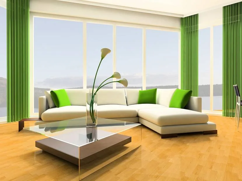Если стены выкрасить салатовым, то рекомендуется поставить белую мягкую мебель, а пол выкрасить песочной краской. Добавить несколько плетеных кресел стульев – и получится гостиная в модном экостиле, особенно если подобрать соответствующий текстиль.