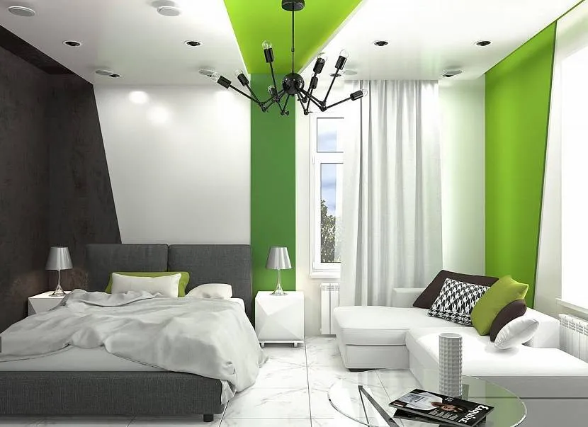 Для спальни в стиле хай-тек и модерн используются яркие оттенки. Чтобы спальня выглядела при этом более спокойной, лучше всего зеленым отделать только одну стену.