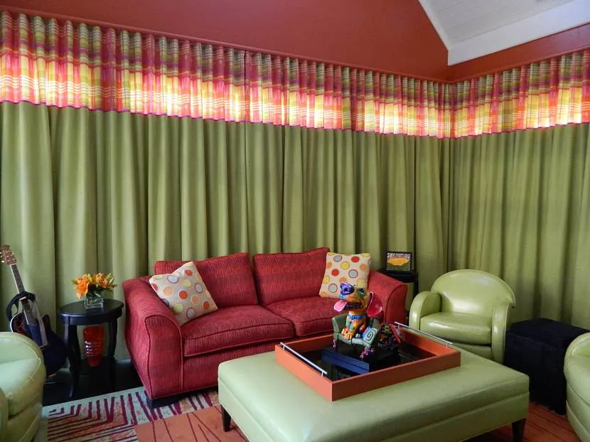 - Шторы к зеленым обоям цвета бирюзы, небесно-голубого, синего цвета, или сочного красного, оранжевые и желтого цвета будут смотреться оригинально.